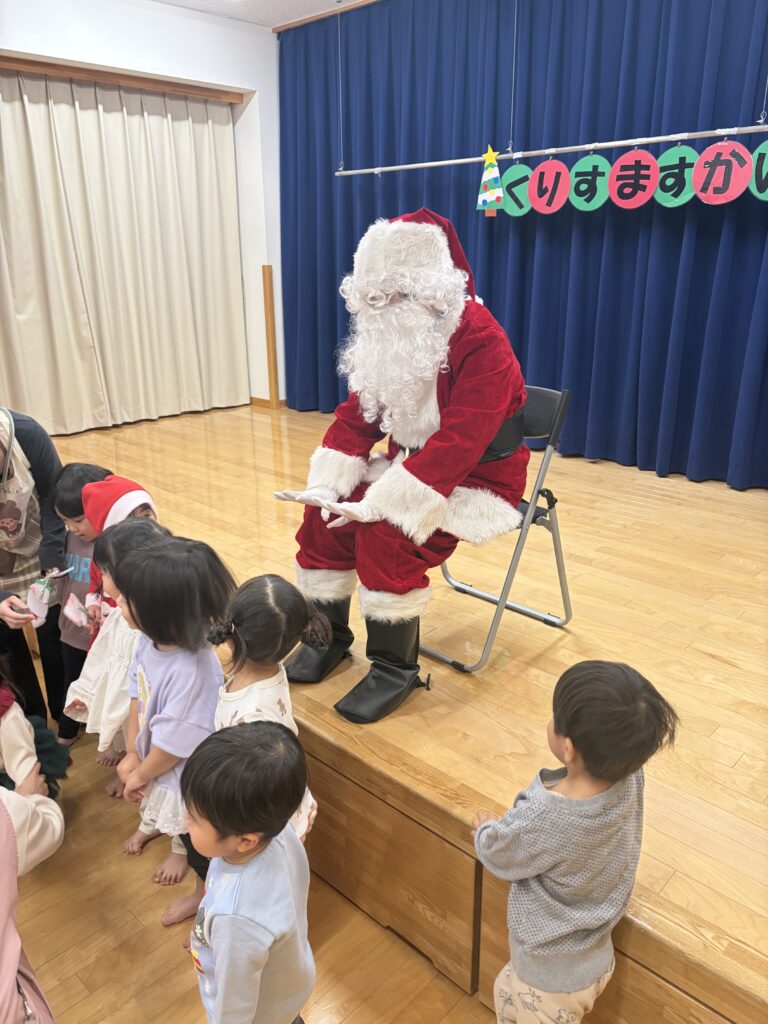 12月24日、保育園では毎年恒例のクリスマス会を行いました。各クラスからは、心のこもったクリスマス製作の発表があり、先生たちからはクリスマスにまつわるお話を聞きました。そして、いよいよサンタさんが登場。子どもたちは大喜びで、サンタさんから図書カードのプレゼント…