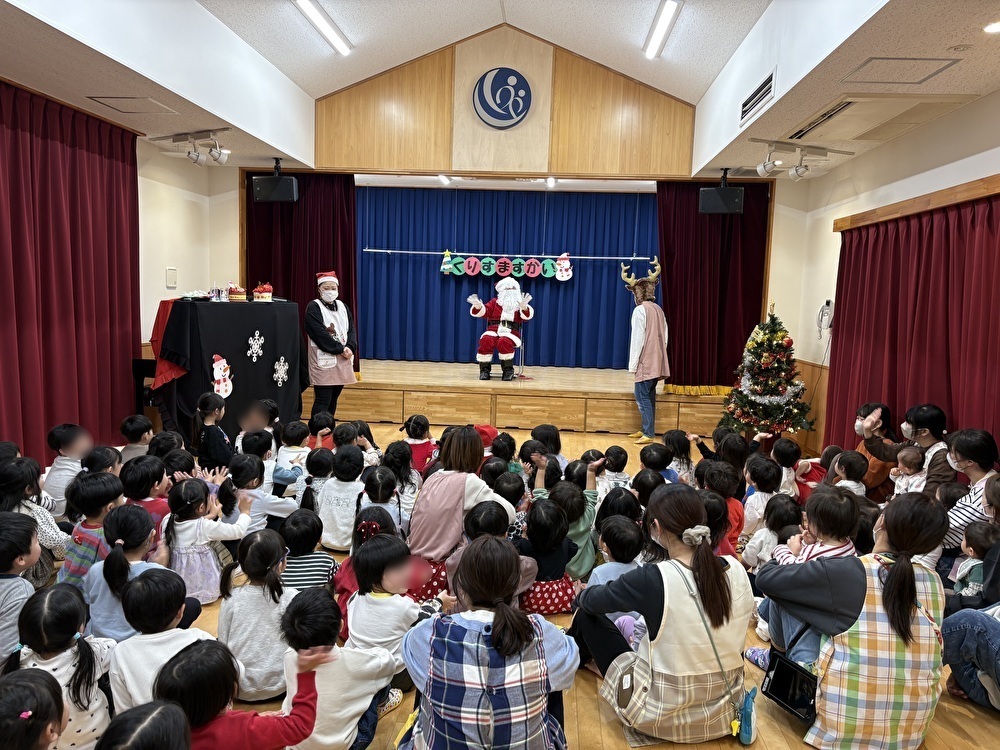12月24日、保育園では毎年恒例のクリスマス会を行いました。各クラスからは、心のこもったクリスマス製作の発表があり、先生たちからはクリスマスにまつわるお話を聞きました。そして、いよいよサンタさんが登場。子どもたちは大喜びで、サンタさんから図書カードのプレゼントをいただきました。笑顔あふれる、楽しいクリスマス会となりました。保護者会の皆様、子どもたちへの毎年のプレゼント有難うございます。